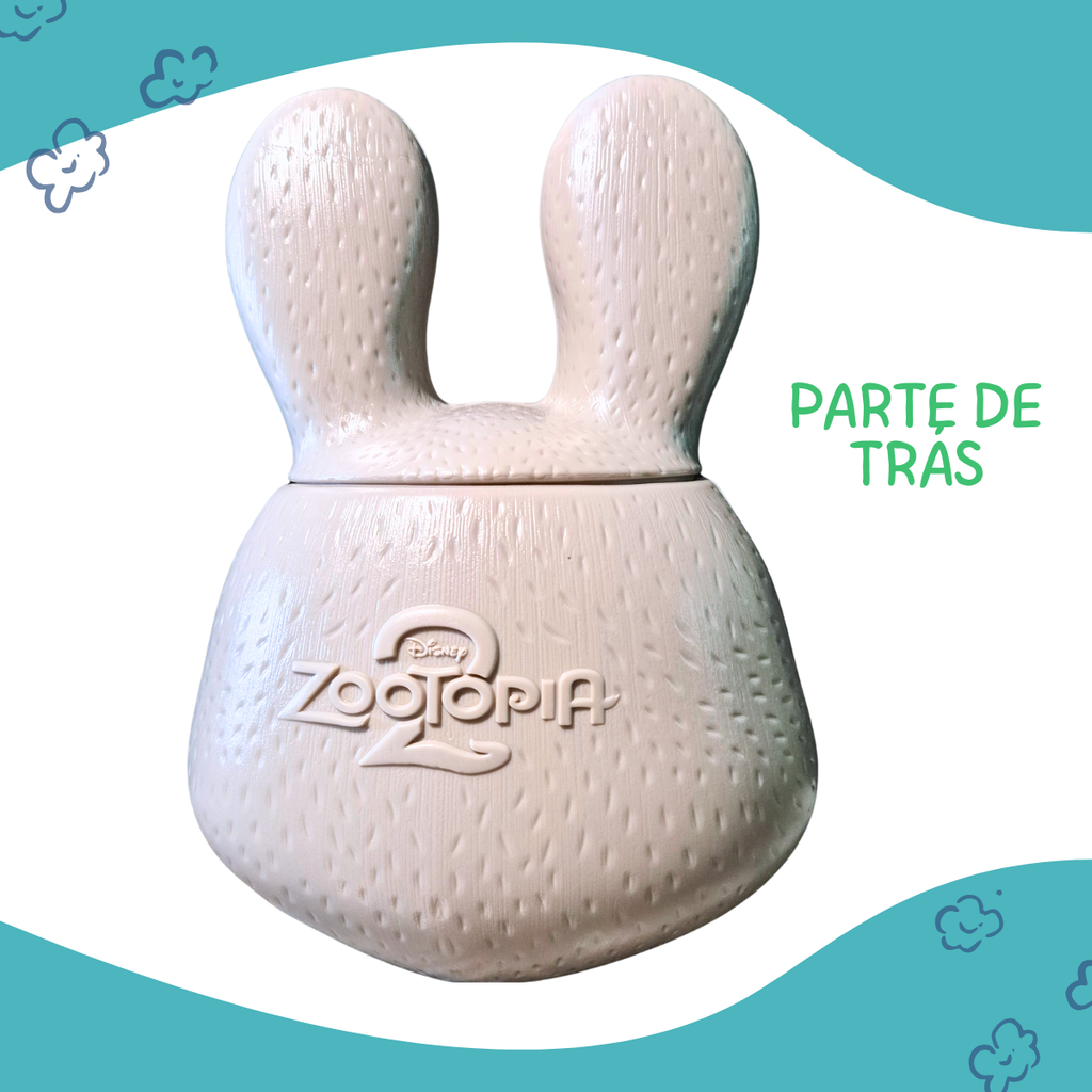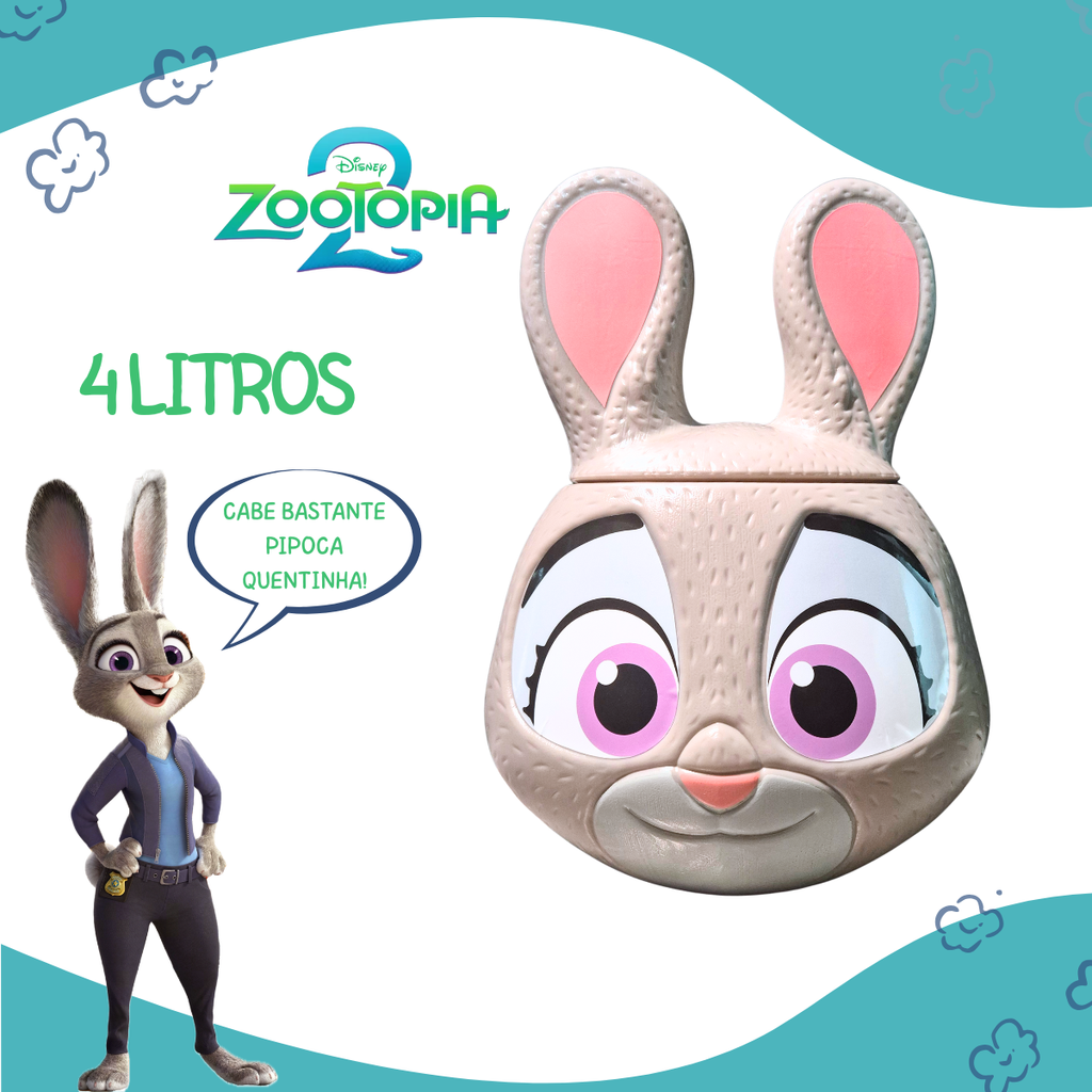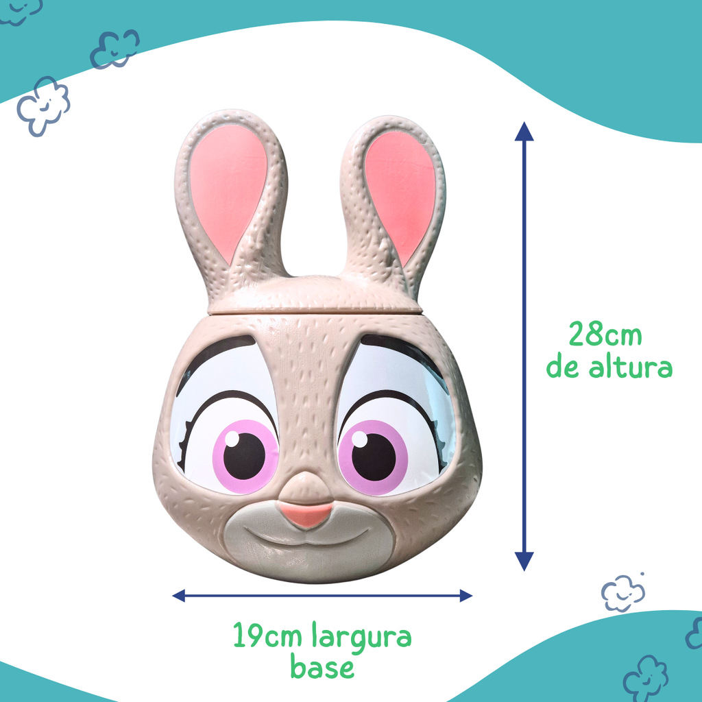 Feito em plástico resistente, o balde em formato de coelhinha traz o rosto da Judy Hopps com acabamento detalhado e orelhas altas, deixando o produto marcante e perfeito pra acompanhar a estreia. Cabe pipoca suficiente pra curtir o filme inteiro e ainda vira peça de coleção depois da sessão.