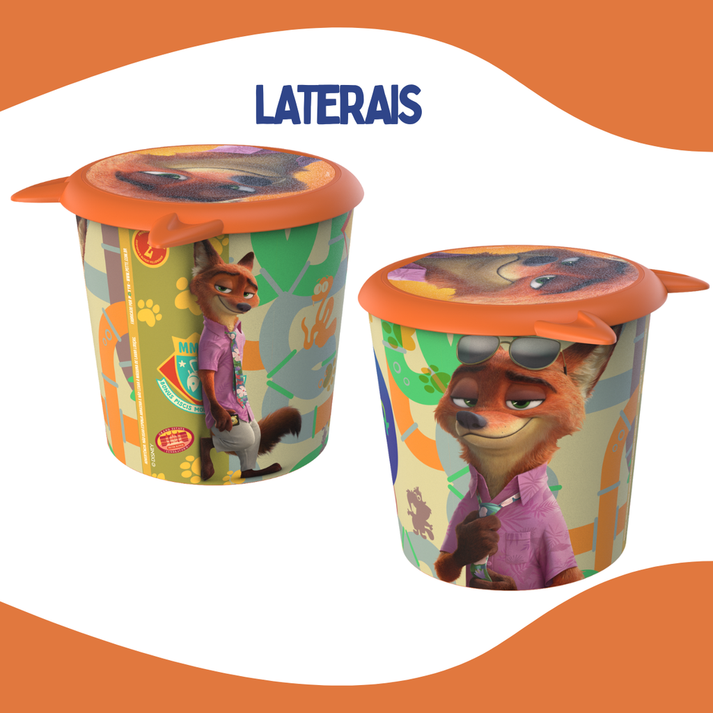 Feito em plástico super resistente e com 4 litros de capacidade, o balde tem tampa exclusiva com orelhas do Nick Wilde e arte colorida inspirada no novo longa da Disney. Cabe bastante pipoca quentinha pra curtir o filme e levar pra casa.